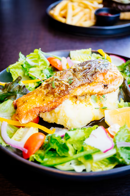 Fresh Spring Vegetables with Mild Wet Roast Chicken Flavored with Garlic croutons and a Light Lemon dressing, Parmesan Shavings and Oregano Wedges.