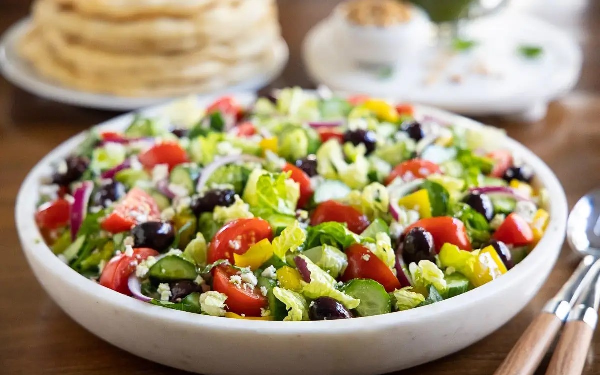 Iceberg lettuce with tomato wedges, onion rings cucumber , olive and topped with feta cheese and garlic herb vinaigrette